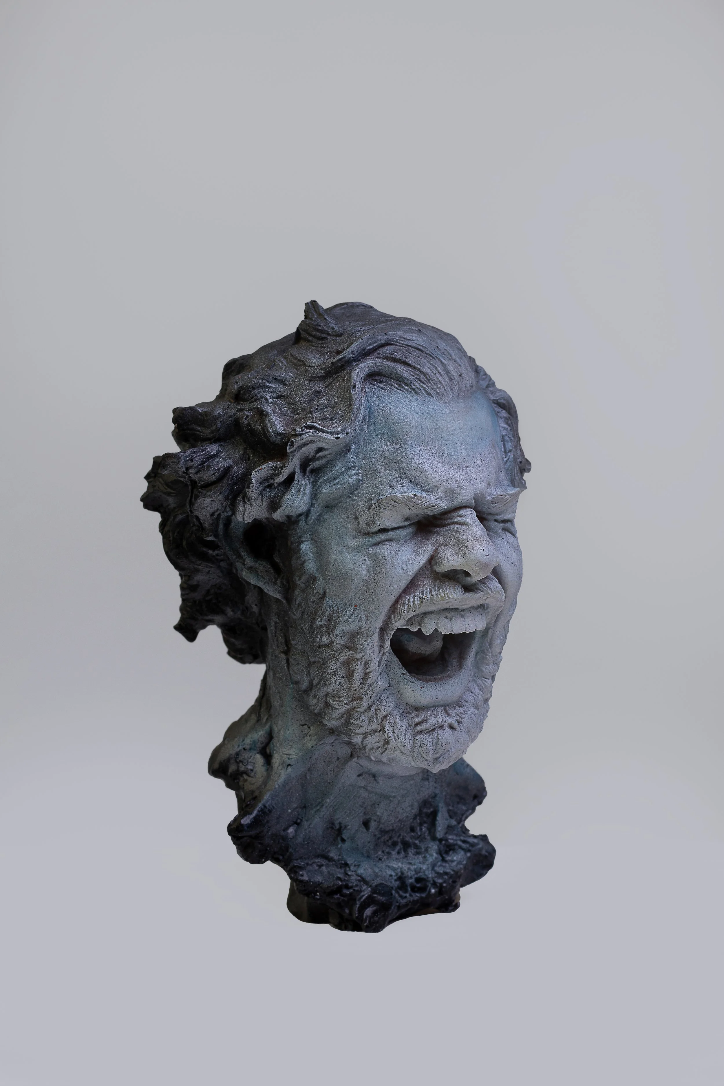 A self-portrait that screams at the peak of intensity, like an explosion of accumulated emotions. The work captures the threshold between the human and the sculptural, between personal rupture and collective catharsis. The polychromy accentuates the raw expressiveness of the gesture, while the pedestal elevates it as a totem of shared vulnerability.