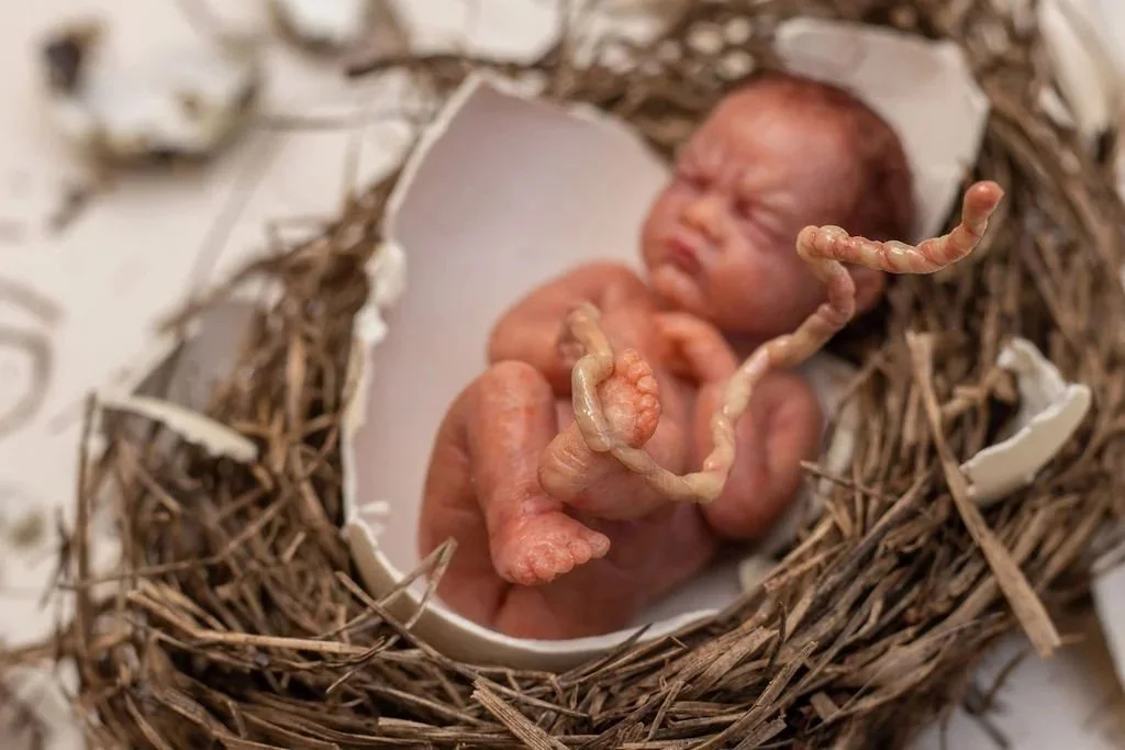 “Corpus Alienum” —a medical term for a foreign body lodged within an organism— becomes a metaphor of belonging and exclusion. The work depicts a newborn breaking out of the nest while kicking the umbilical cord, a gesture that expresses rejection, uprooting, and at the same time, the struggle for affirmation.